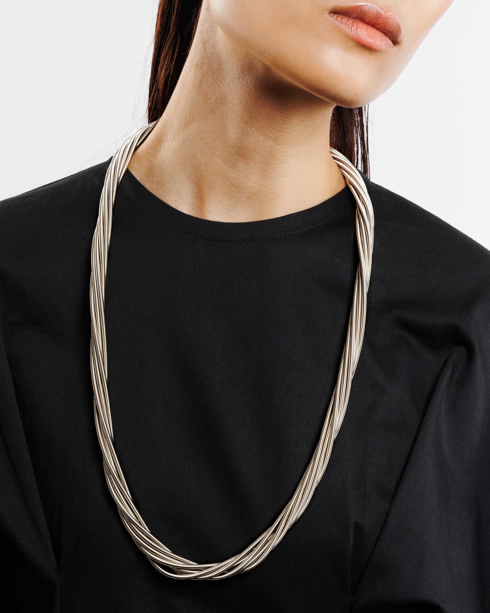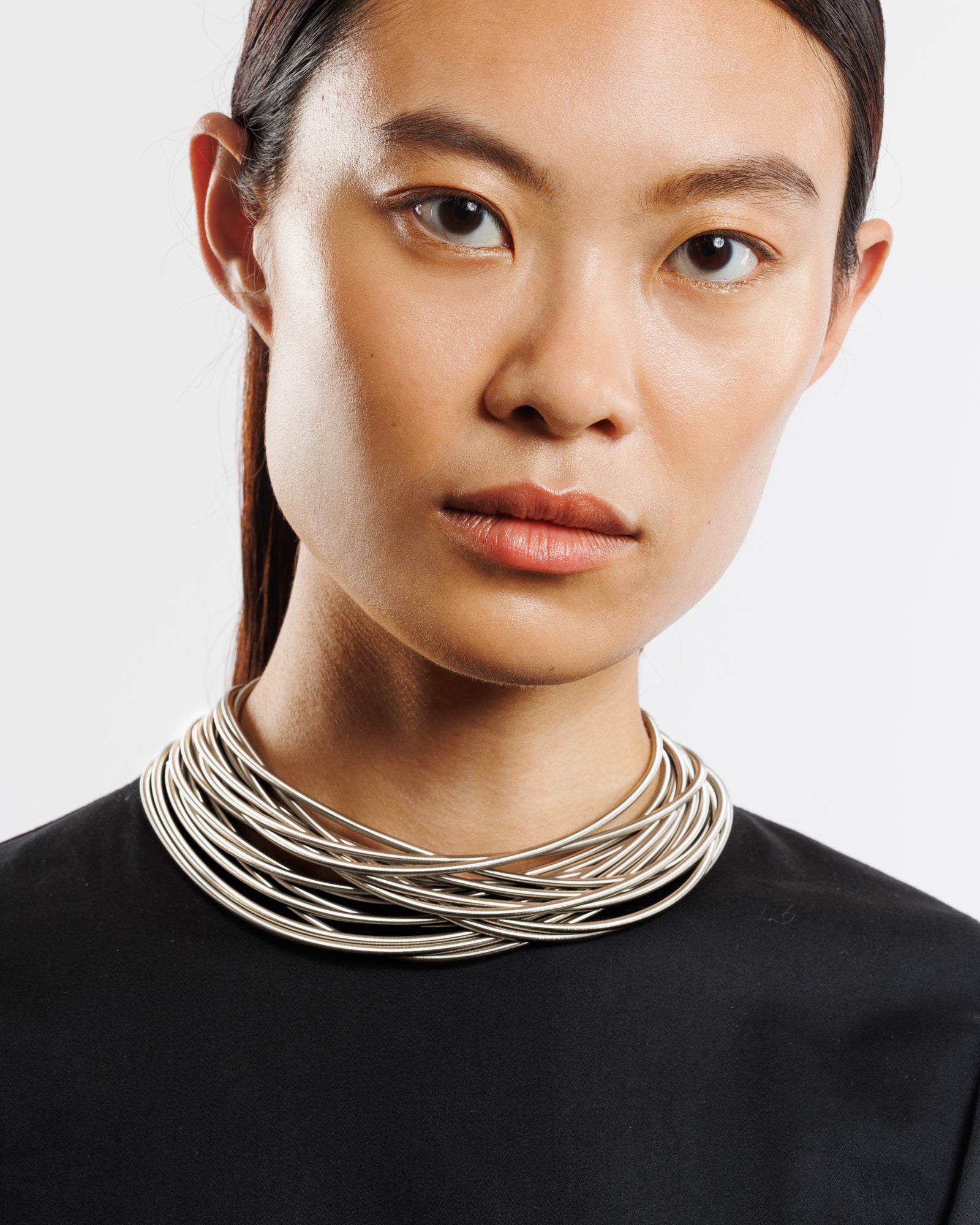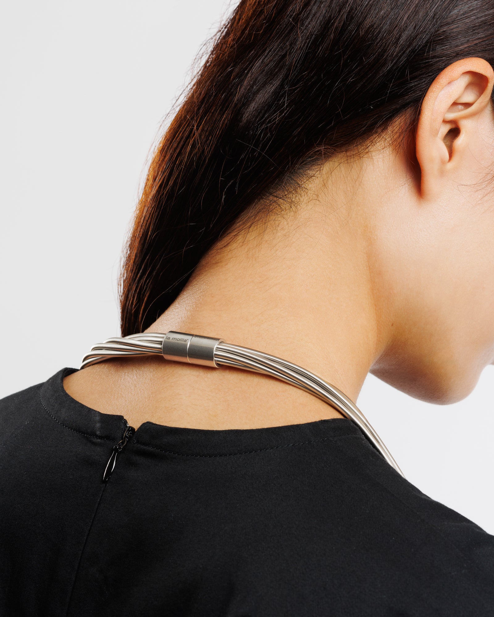 La Collana N°5 di La Mollla unisce rigore progettuale e versatilità d’uso: realizzata in acciaio inossidabile grazie a micro‑molle altamente elastiche, si adatta al busto con un andamento fluido che cattura la luce e crea giochi di piega e movimento.