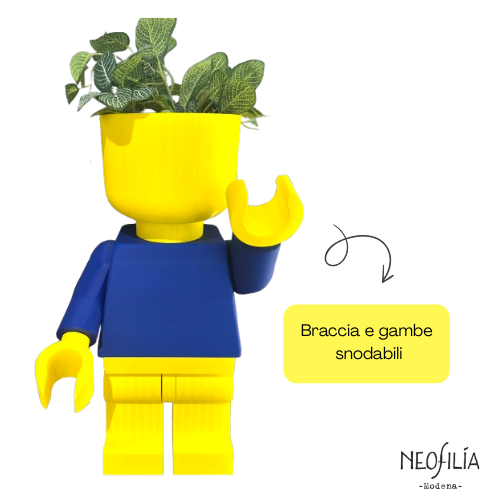 Leg-omino XL è il nuovo membro della collezione di Leg-omini di Neofilia, alto 70 cm e realizzato in plastica dura tramite stampa 3D. La testa cava lo trasforma in un pratico PORTAVASO o SVUOTA TASCHE, combinando funzionalità e design giocoso. Il corpo giallo con la maglietta blu aggiunge un tocco di colore e personalità, perfetto per arricchire qualsiasi ambiente domestico o ufficio. Leg-omino XL è leggero, facile da spostare e resistente, ideale per chi cerca un oggetto decorativo unico con un’utilità concreta.