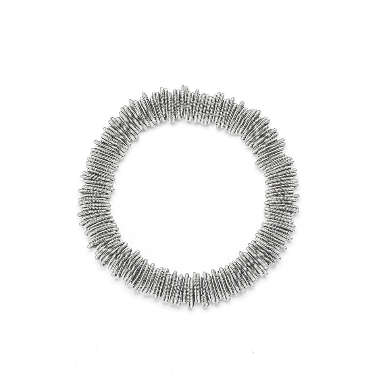 Il bracciale N°2 di La Mollla unisce rigore industriale ed eleganza sottile: realizzato con micro‑molle in acciaio inossidabile, avvolge il polso con leggerezza e movimento fluido, mantenendo una struttura definita e distintiva.