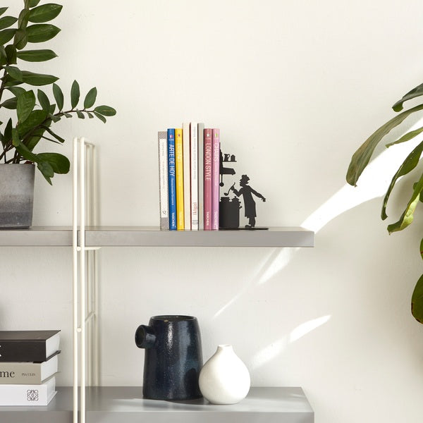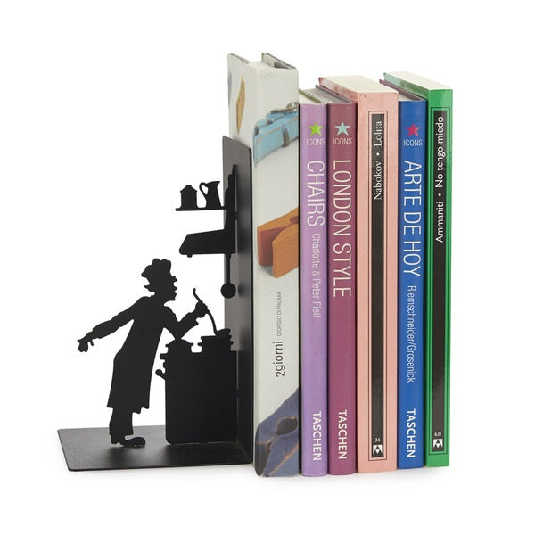 Il fermalibri Le Chef – Nero unisce funzionalità e design originale: realizzato in metallo verniciato, presenta la sagoma stilizzata di un cuoco intento a cucinare, creando un effetto visivo distintivo e dinamico.