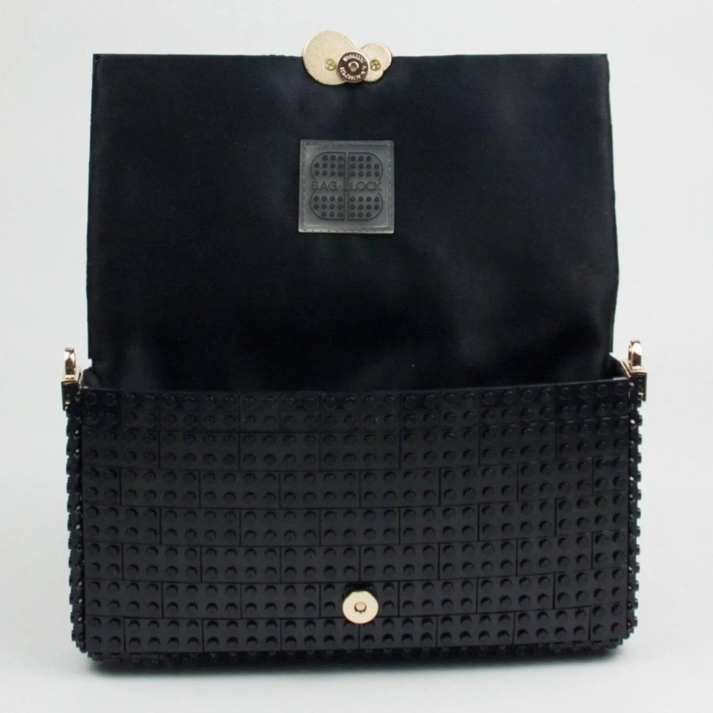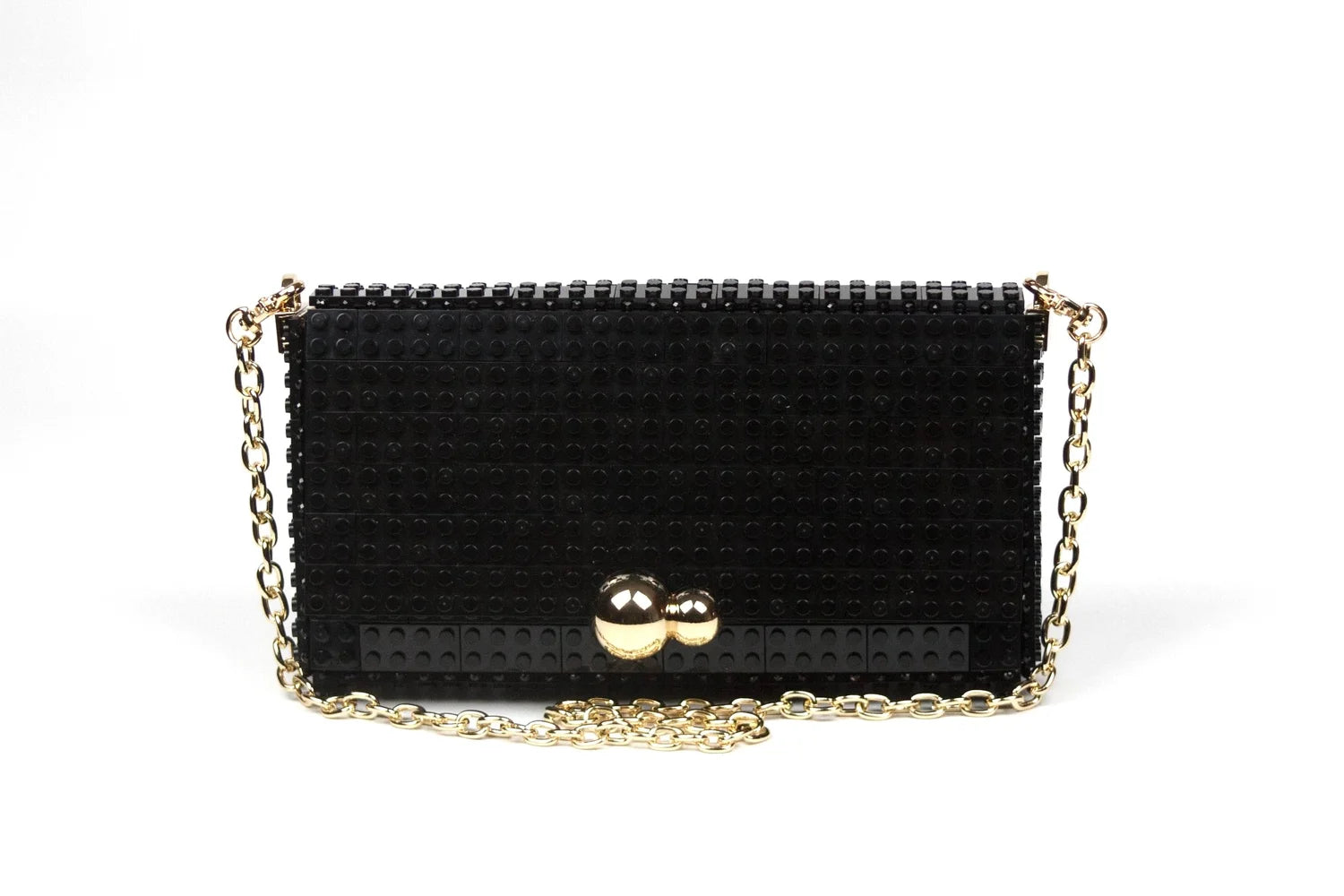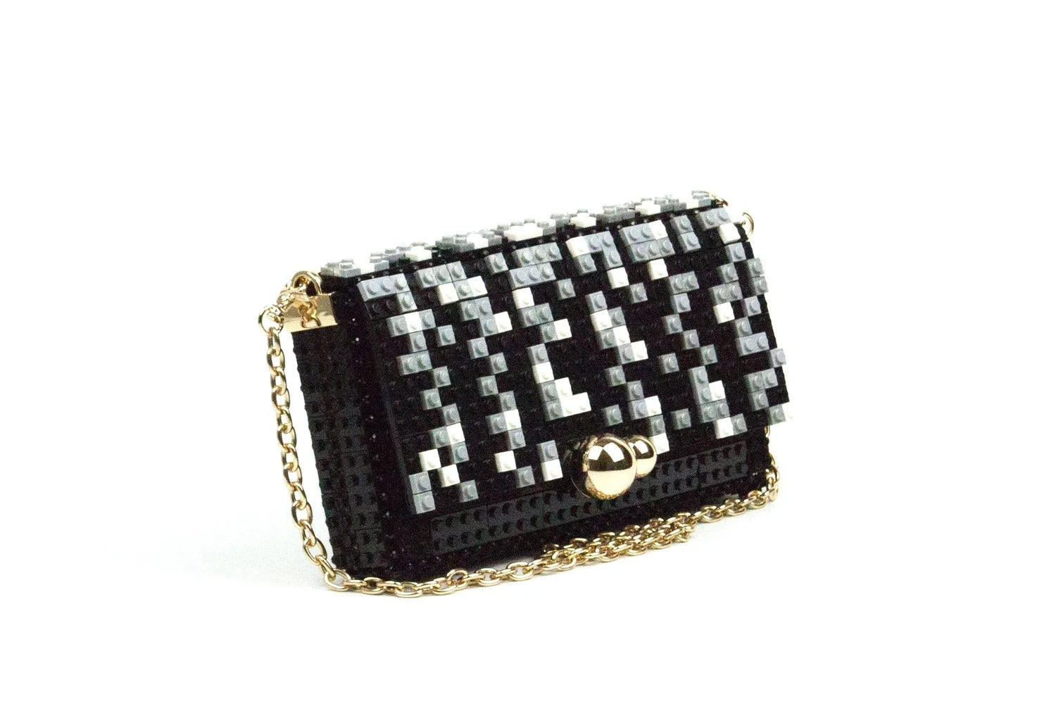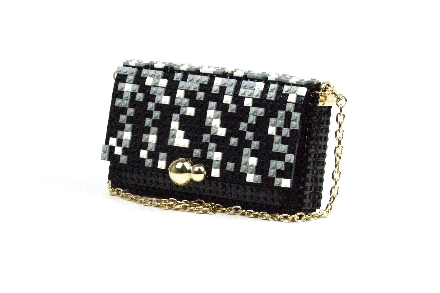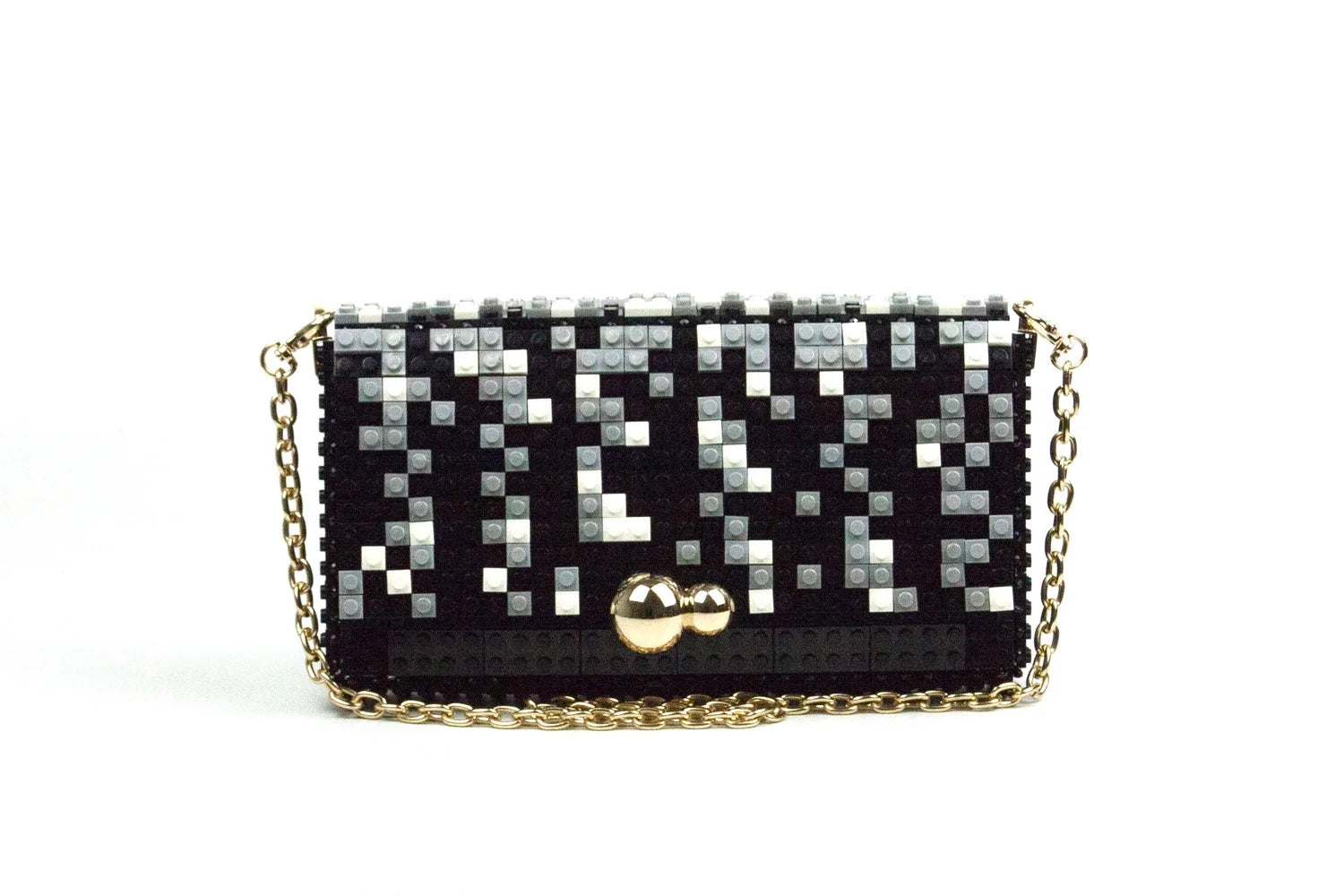 Questa clutch quadrata unisce giocoso design e artigianalità raffinata: costruita con 196 blocchi ABS assemblati a mano, ricrea un motivo “rainy” (pioggia) su sfondo nero grazie ai blocchi In&Out rimovibili. Il design è personalizzabile e può essere modificato in qualsiasi momento: cambia i top block quando vuoi, per adattare la borsa al tuo stile.