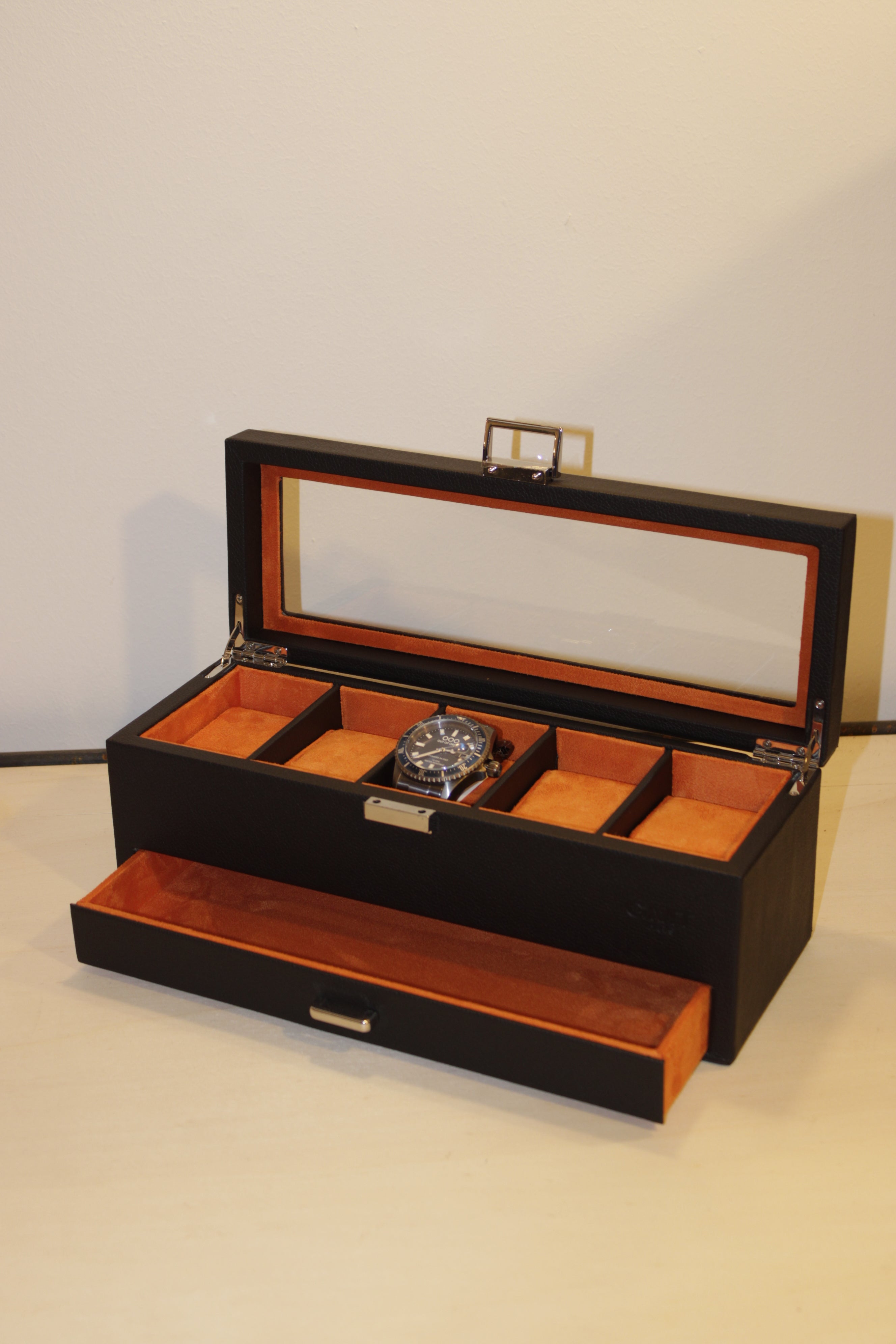 Porta orologi grande con coperchio trasparente – nero e arancione